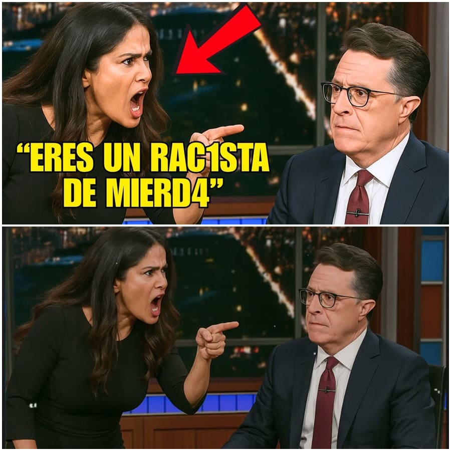 El estudio está lleno de energía cuando Stephen Colbert presenta a su siguiente invitada. Salma Hayek entra al escenario y se sienta en el sofá mientras el público aplaude con entusiasmo. Salma Hayek está aquí, damas y caballeros, anuncia Stepen con su característica sonrisa.