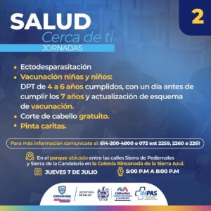 Con el objetivo de brindarle a las familias chihuahuenses servicios de salud de manera gratuita, al igual que de informar a la ciudadanía acerca del trabajo que el IMPAS; por lo cual, esta jornada estará en el parque ubicado entre las calles Sierra de Pedernales y Sierra de la Candelaria, para que asistan las y los residentes de esta colonia, así como de zonas aledañas.