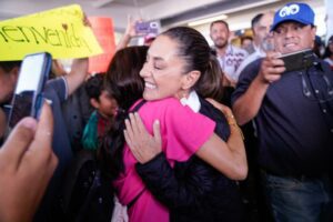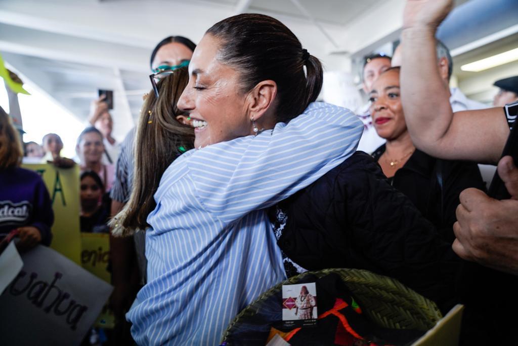 Claudia Sheinbaum fue arropada por el cariño de simpatizantes quienes la recibieron en el Aeropuerto Internacional de Chihuahua, con porras y cárteles en las que se podían leer mensajes de apoyo como ¡Es tiempo de Claudia!