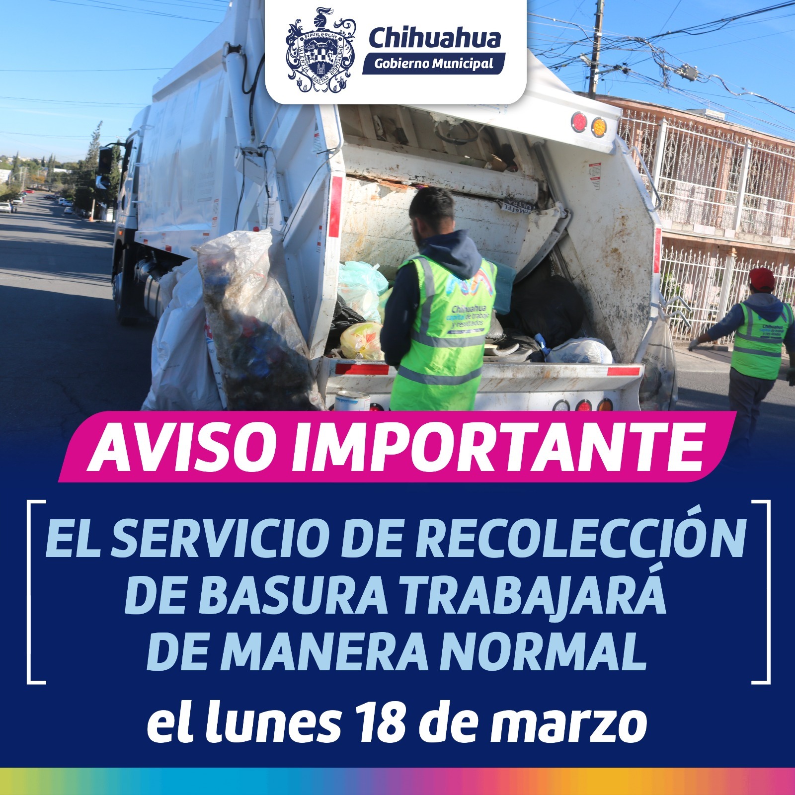 El servicio de recolección de basura habitacional se realizará de manera regular, por lo que se invita a los chihuahuenses que les corresponde sacar la basura ese día, lo hagan de la forma acostumbrada.