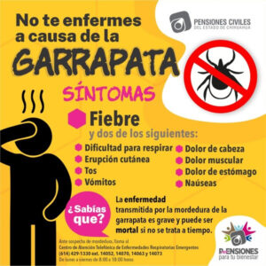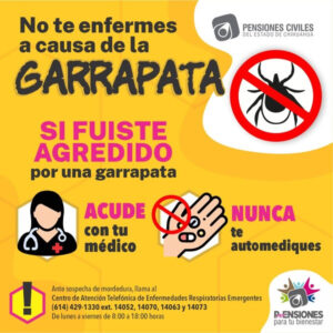 Ante cualquier sospecha de mordedura de garrapata o si presenta síntomas, acudir de inmediato al área de Urgencias o llamar al Centro de Atención Telefónica de Pensiones Civiles del Estado al teléfono (614) 4291330 extensiones 14052, 14070, 14063 o 14073.
