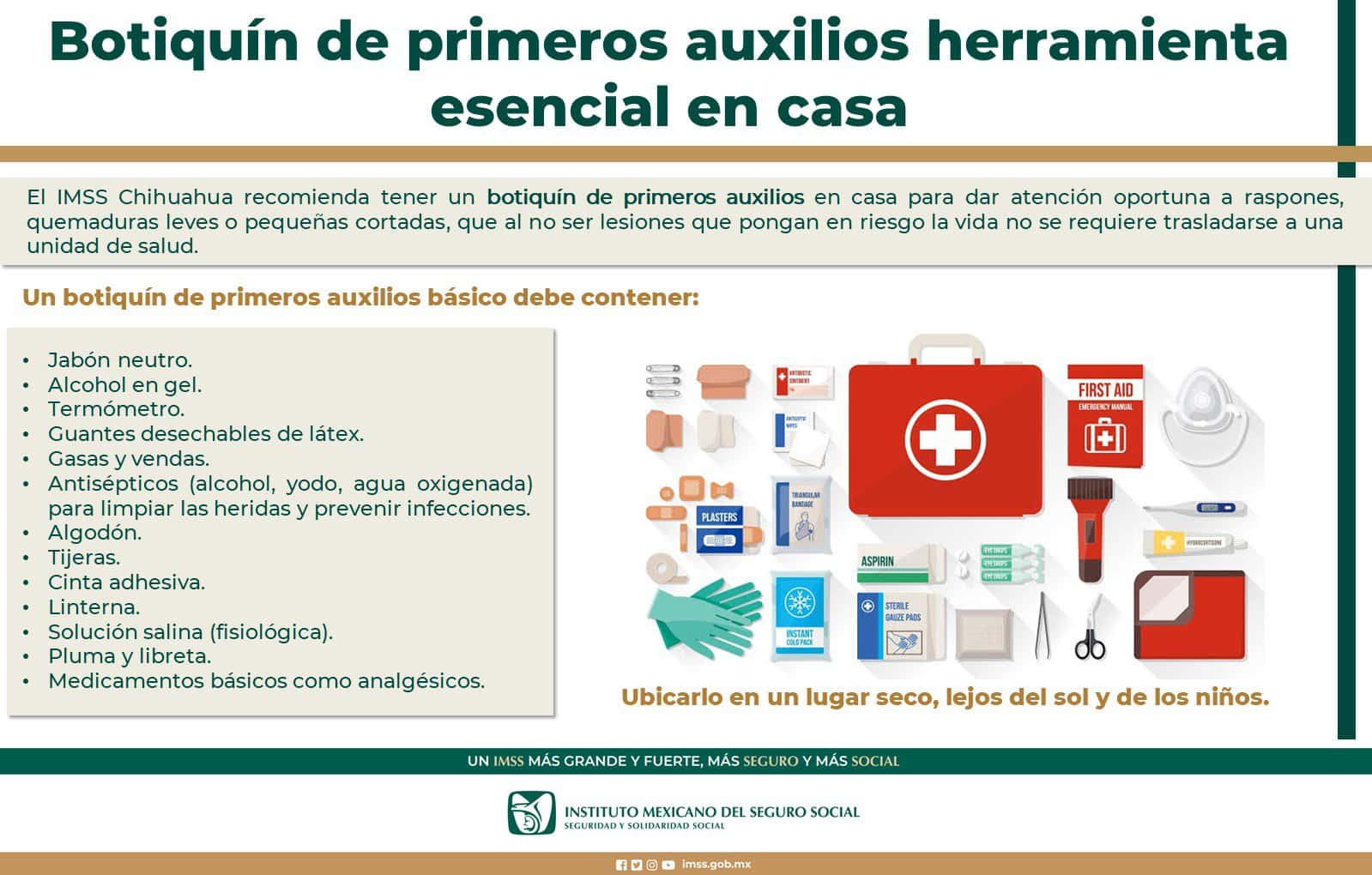 El Instituto Mexicano del Seguro Social (IMSS) en Chihuahua recomienda a la ciudadanía contar en casa con un botiquín para la atención primaria de un accidente.