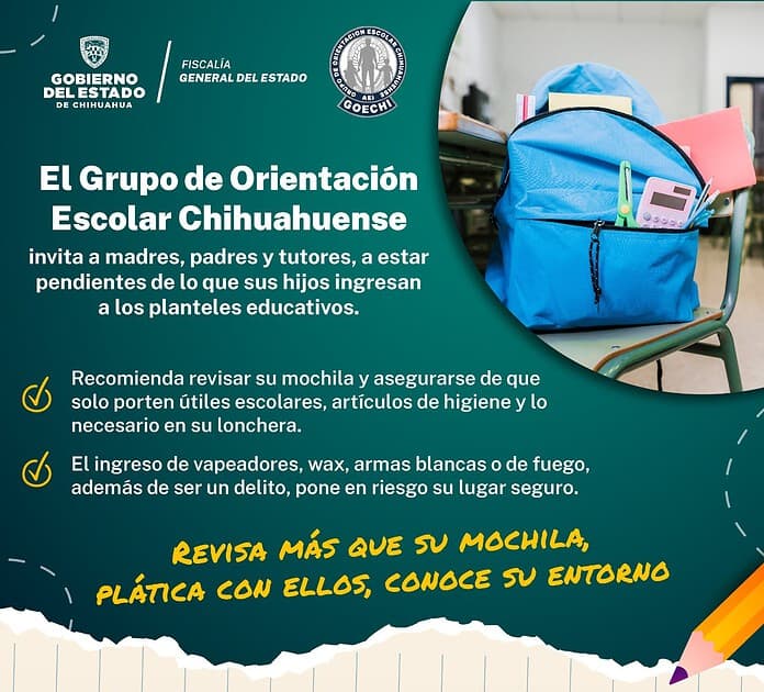 Con el objetivo de prevenir e inhibir conductas antisociales en las escuelas, la Fiscalía de Distrito Zona Norte, a través de la Agencia Estatal de Investigación y el Grupo de Orientación Escolar Chihuahuense (GOECHI), invita a madres, padres de familia y tutores, para que estén al pendiente de lo que los estudiantes incluyan entre las pertenencias que cargan en sus mochilas.