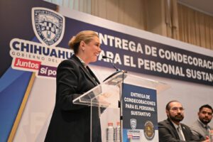 La gobernadora Maru Campos encabezó la entrega de 129 condecoraciones y estímulos a personal sustantivo de la Fiscalía General del Estado (FGE), por los méritos obtenidos y los años de servicio en la dependencia.