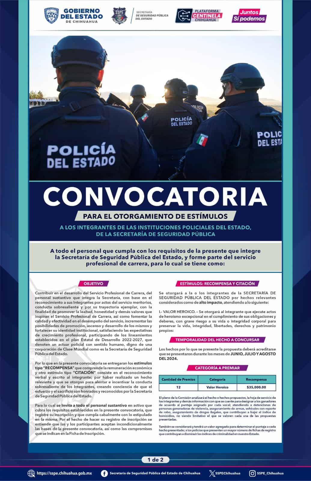La Secretaría de Seguridad Pública del Estado (SSPE), lanzó la convocatoria para la Entrega de Estímulos correspondiente al tercer trimestre de 2024, por medio de la cual se incentivará con estímulos de hasta 80 mil pesos a los policías más destacados.