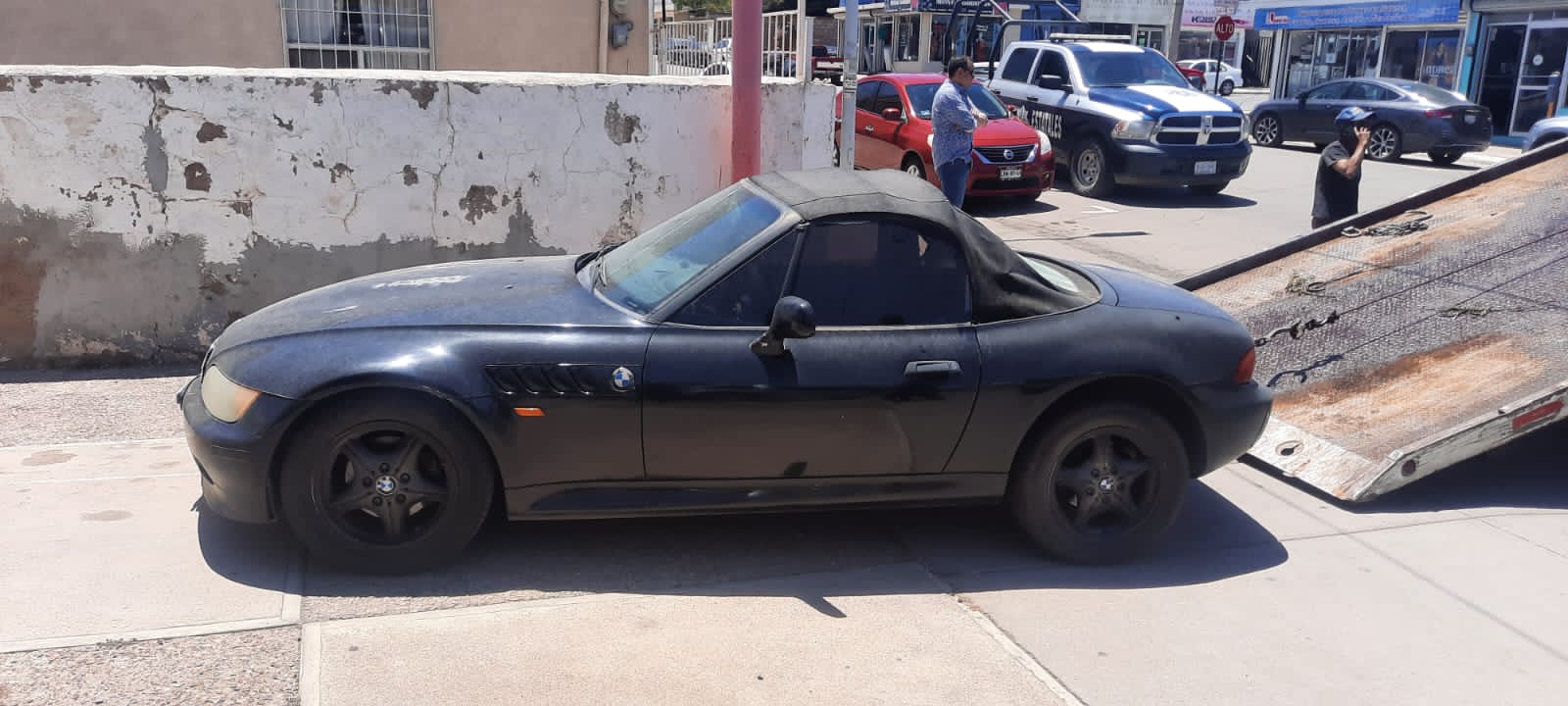 El automóvil, de la marca BMW línea Z3 de color negro, convertible, se encontraba sobre la acera por lo que fue necesaria la presencia de una grúa para ayudar con su traslado ante la Fiscalía General del Estado Zona Occidente.