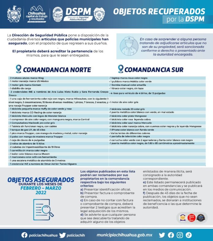 Con el objetivo de que los legítimos propietarios de objetos asegurados por policías municipales mediante los patrullajes ordinarios o detenciones realizadas durante los últimos meses, puedan recuperarlos, la Dirección de Seguridad Pública Municipal (DSPM) emite el listado correspondiente a más de 50 artículos que pueden ser encontrados en las comandancias Norte y Sur.