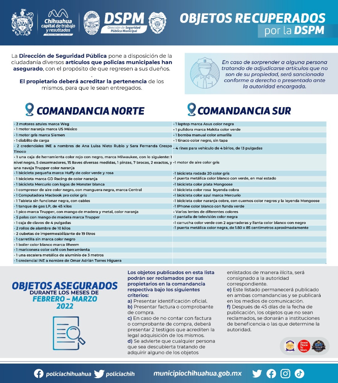 Las personas interesadas deberán acudir a las comandancias Norte o Sur, ubicadas en la avenida Homero 500, en la colonia Revolución, o bien, en las avenidas Pacheco y Pedro Meoqui, en la colonia Lealtad II, en horario de lunes a viernes, de 09:00 a 15:00 horas, para cotejar los listados y determinar si se trata de artículos de su propiedad, en cuyo caso deberán cumplir con los siguientes requisitos: