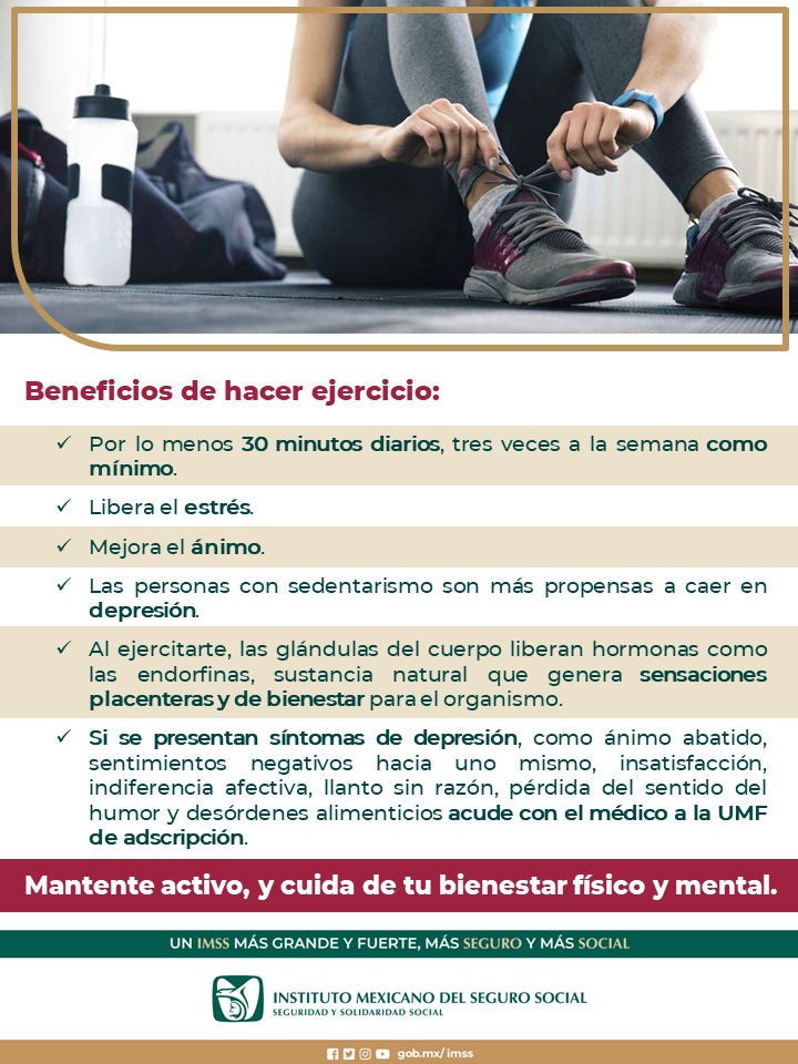 El Instituto Mexicano del Seguro Social (IMSS) en Chihuahua, a través de la Jefatura de Servicios Médicos, exhorta a la población a realizar cualquier tipo de ejercicio físico o simplemente caminar 30 minutos diarios, tres veces a la semana como mínimo, tras destacar que es esencial para liberar el estrés y mejorar el estado de ánimo que producen los actuales estilos de vida.
