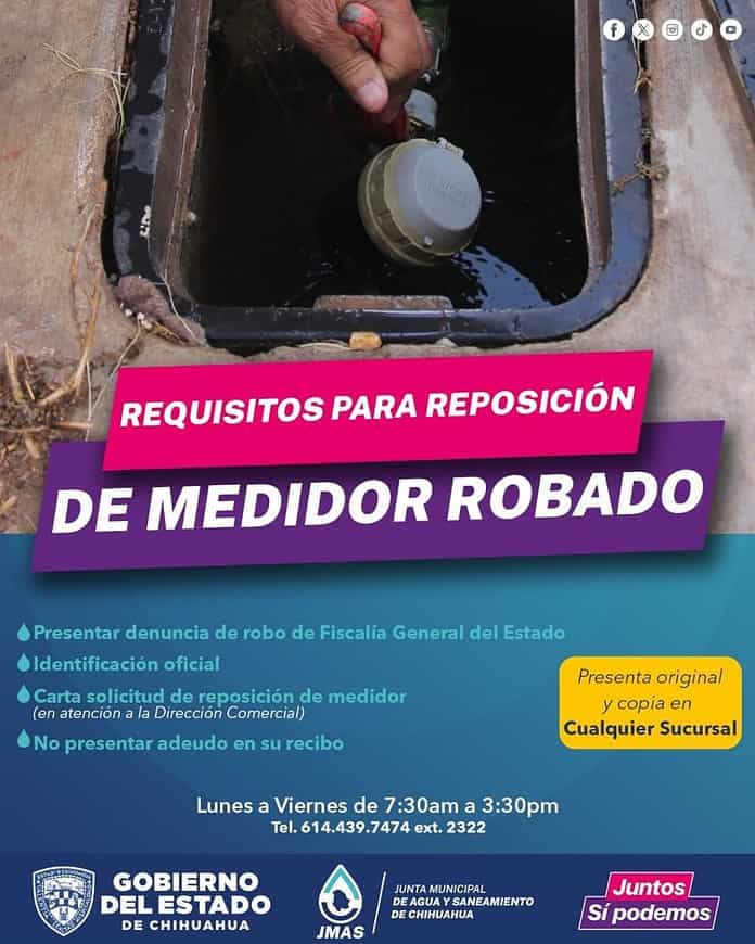 La Junta Municipal de Agua y Saneamiento (JMAS) de Chihuahua, dio a conocer a la ciudadanía la lista de requisitos así como el procedimiento a seguir para solicitar la reposición de un medidor en caso de daños o robo del mismo.