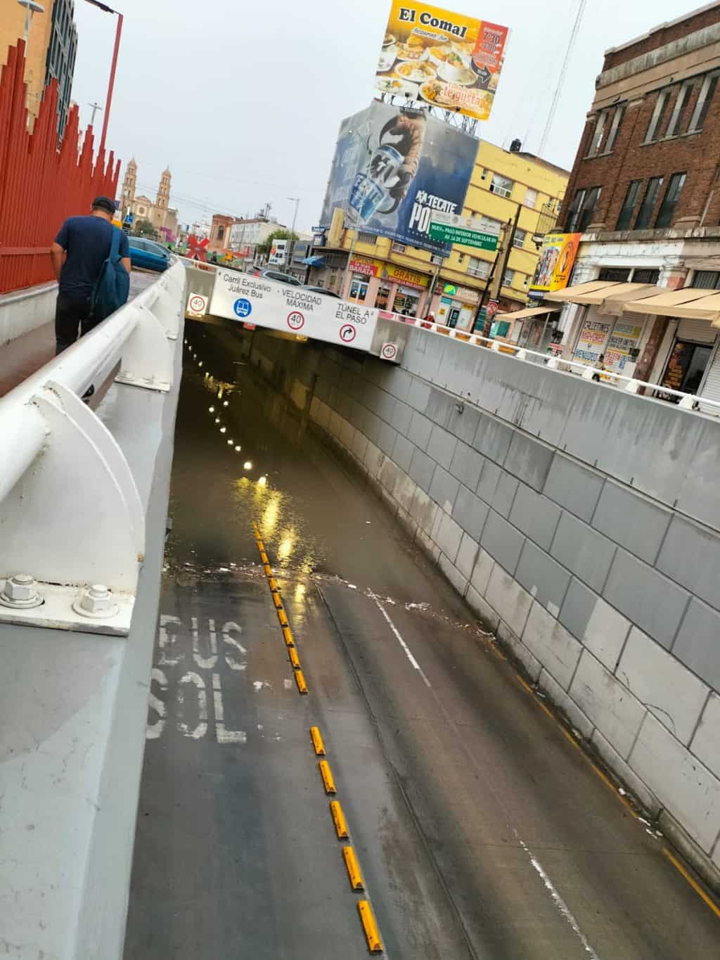 Ciudad Juárez.- La falta de mantenimiento por parte de Obras Públicas del Municipio al túnel de la 16 de Septiembre, provocó que nuevamente se inundara durante las lluvias que se estan presentando en la ciudad y obligó al JuárezBus a suspender su recorrido por el Centro Histórico.