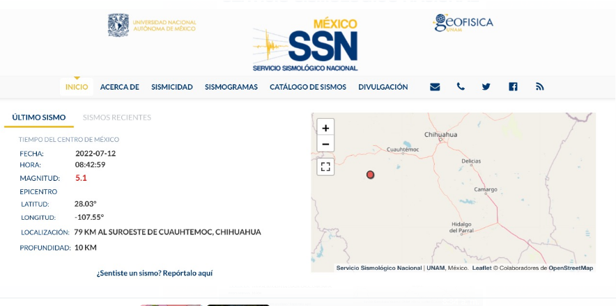El Servicio Sismológico Nacional, informó que a las 8 de la mañana con 42 minutos 59 segundo se registró un importante sismo de magnitud 4.6, cuyo epicentro fue a 79 kilómetros al suroeste de ciudad Cuauhtémoc y con una profundidad de 10 kilómetros.