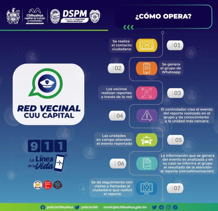 La “Red Vecinal CUU Capital”, lanzada para efectuar reportes a la Dirección de Seguridad Pública Municipal (DSPM), adicional a la línea 9-1-1, sigue sumando personas y registra a la fecha 274 grupos formados en diversas colonias de la ciudad, con más de 5 mil 600 usuarios que son atendidos mediante mensajes vía WhatsApp, que fortalece la confianza y la cercanía entre la comunidad y la corporación.