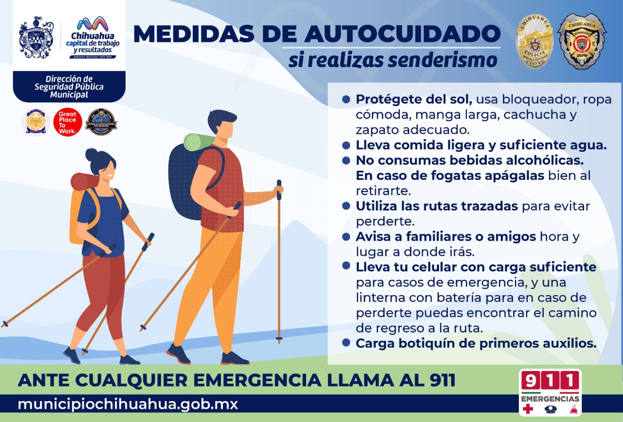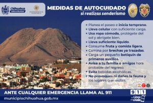 La Dirección de Seguridad Pública Municipal de Chihuahua, a través de la Subdirección de Bomberos y Rescate, recomienda a quienes gustan de realizar senderismo, caminar o escalar en cerros aledaños a la ciudad, extremar precauciones, debido al incremento de fauna silvestre, pues durante la temporada de lluvias suele incrementarse su presencia.