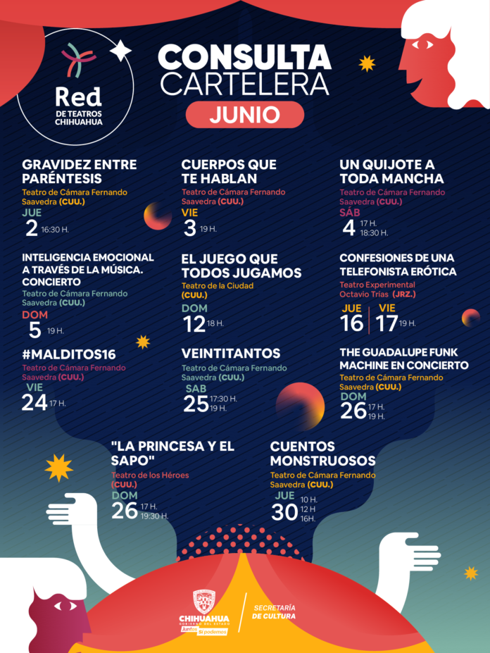 La Secretaría de Cultura, da a conocer la cartelera del mes de junio del programa Red de Teatros 2022, que presentará puestas en escena tanto en la Capital como en Ciudad Juárez, del 2 al 30 de junio en los diferentes teatros de los citados municipios.