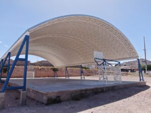 Asimismo, se instaló una cubierta tipo domo a base de lámina en un área de 18.5 metros por 30 metros, con sus armaduras metálicas, colocación de canalones y bajadas para el correcto drenaje pluvial; por otra parte, se pintaron líneas de juego y se instalaron canastas y porterías metálicas.