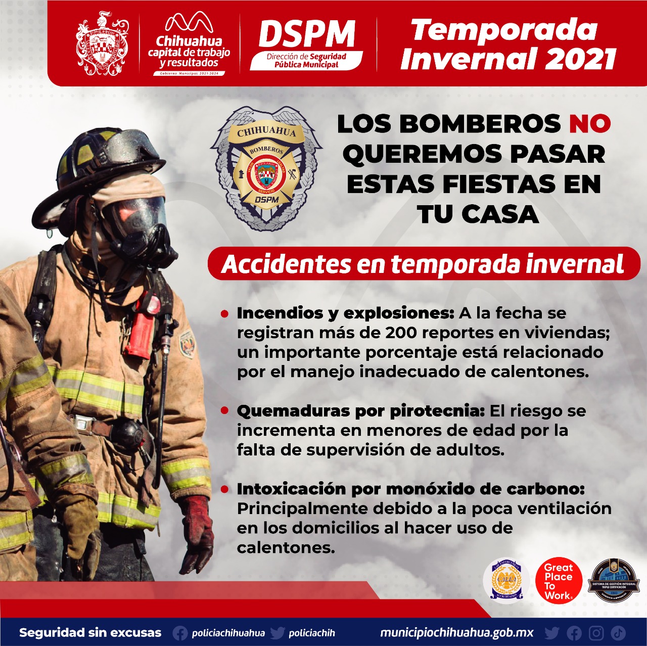 Debido a las bajas temperaturas que se han presentado y que continuarán durante toda la semana, el Cuerpo de Bomberos exhorta a la población a seguir las recomendaciones preventivas para evitar accidentes derivados del mal uso o deficiente instalación de calefactores que producen monóxido de carbono, pueden provocar incendios o presentar fugas de gas, con resultados muchas veces fatales.