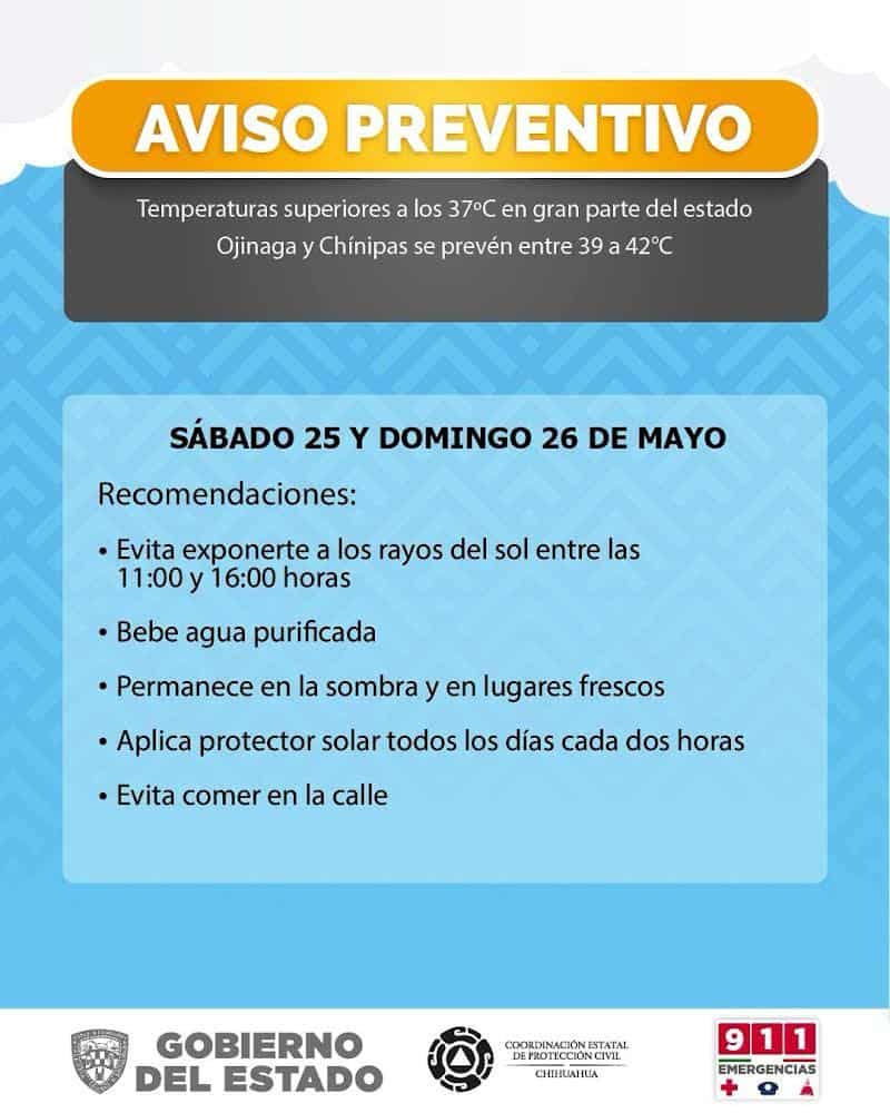 Las temperaturas esperadas para ese día son (máx/min °C): Chihuahua 37, Juárez 35, Janos 33, Madera 27, Temósachic 29, Cuauhtémoc 31, Ojinaga 40, Delicias 39, Camargo 39, Jiménez 38, Parral 36, Creel 26, Chínipas 41, Guachochi 26 y El Vergel 25.