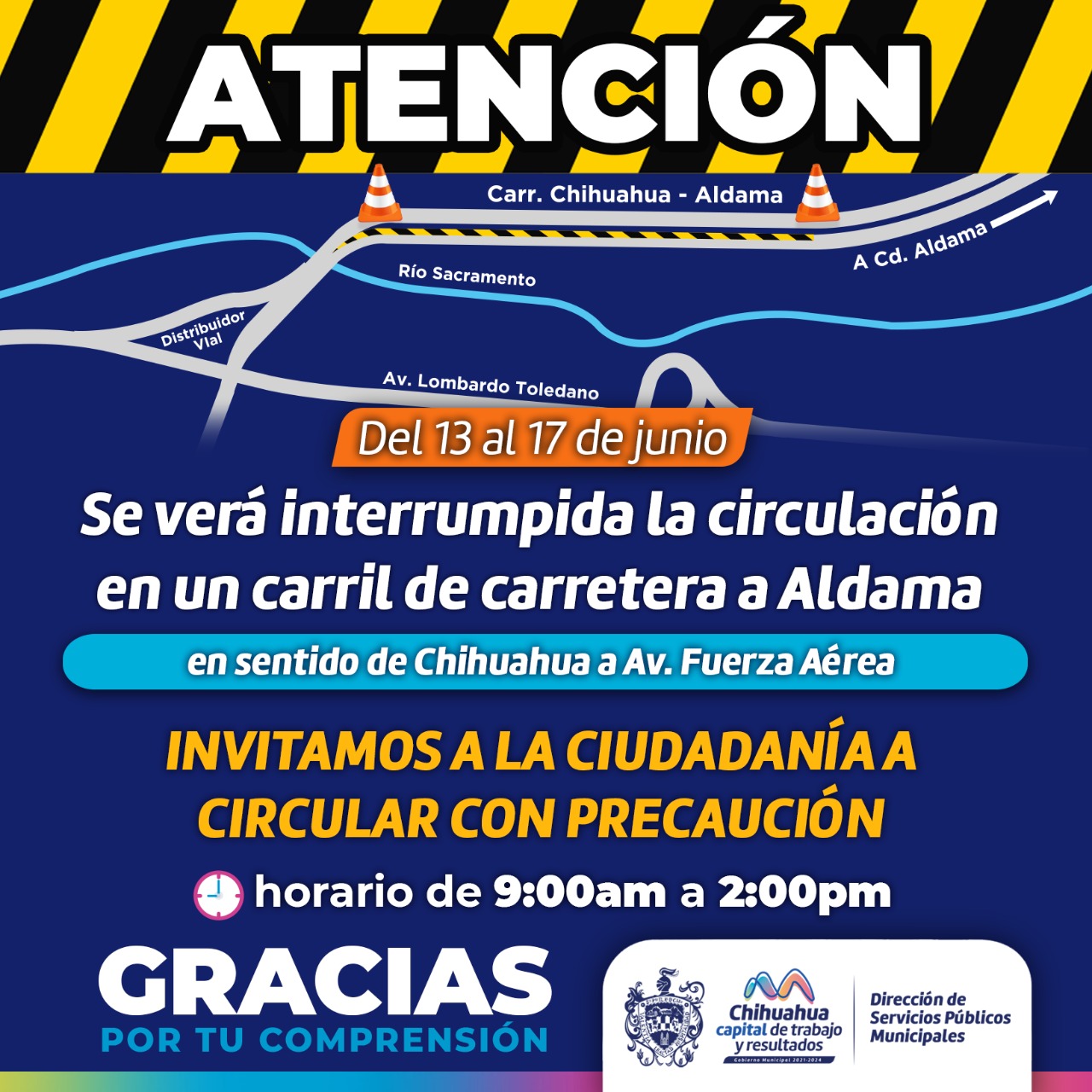Con el objetivo de mejorar la imagen urbana y mantener en buenas condiciones los camellones de la ciudad, el Gobierno Municipal, a través de la Dirección de Servicios Públicos Municipales, trabaja en la limpieza de grava del 13 al 17 de junio en el camellón ubicado en la carretera Chihuahua – Aldama, por ello, se exhorta a la ciudadanía a circular con precaución por la zona que va en el sentido a la avenida Fuerza Aérea.
