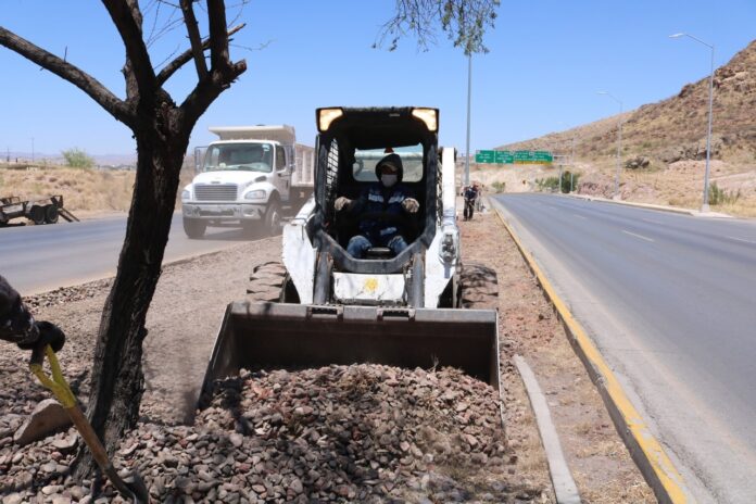 La Dirección de Servicios Públicos Municipales, trabaja en la limpieza de grava del camellón ubicado en la carretera a Aldama.