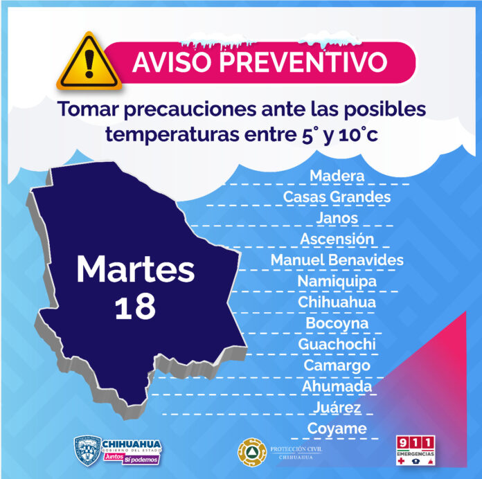 Por otra parte el pronóstico para este día y próximas 72 horas, la masa de aire frío que acompaña al sistema frontal mantendrá la presencia de lluvias en el estado y de un marcado descenso de temperaturas, las cuales podrán tener mayor presencia en el territorio a partir de esta tarde, por tanto, la dependencia estatal emite una alerta ante el pronóstico de temperaturas de -2° y -3° centígrados en Majalca, Madera, Temósachic, Creel, Guachochi y El Vergel.
