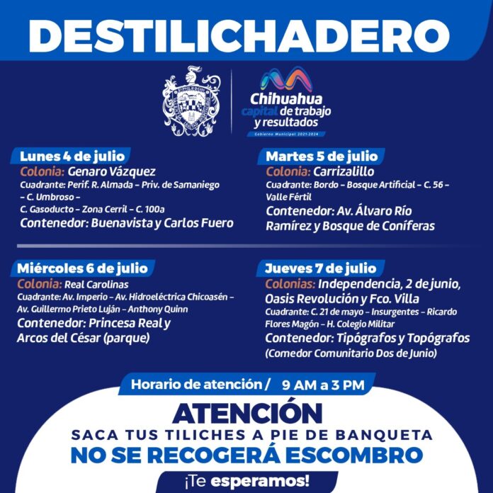 La Dirección de Servicios Públicos Municipales, informa a la ciudadanía el calendario que el programa Destilichadero tendrá del 4 al 7 de julio, donde visitará seis colonias de la ciudad, de 9 de la mañana a 3 de la tarde.