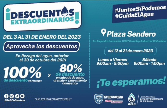 El organismo operador, recordó a la ciudadanía que siguen vigentes los descuentos extraordinarios que tendrán durante todo el mes de enero: 100 por ciento de descuento en recargos y 80 por ciento en rezago de agua, drenaje y saneamiento doméstico.