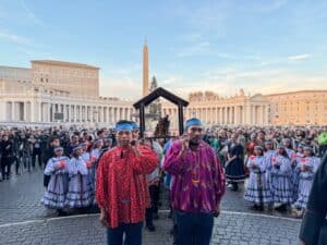 La gobernadora Maru Campos inauguró con un nacimiento rarámuri, la exposición internacional de los cien pesebres que se realiza anualmente en la plaza de San Pedro en la Santa Sede.