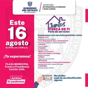 La Secretaría de Desarrollo Humano y Bien Común (SDHyBC), invita a la ciudadanía para que aproveche los servicios que ofrece la feria “Juntos Cerca de Ti”, que se llevará a cabo este viernes 16 de agosto en Carichí.