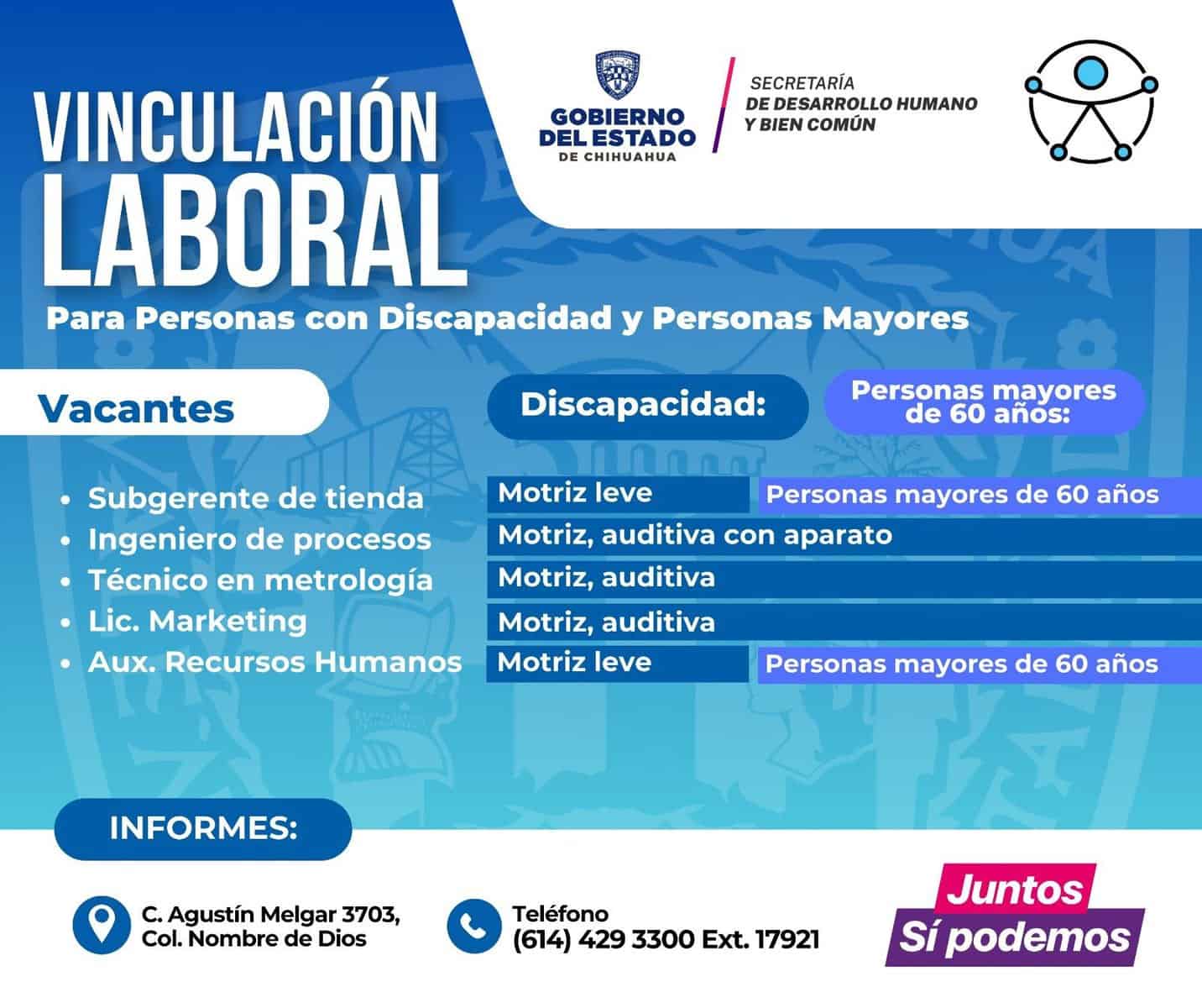 La Secretaría de Desarrollo Humano y Bien Común (SDHyBC), a través del Programa de Vinculación Laboral, anunció nuevas ofertas de trabajo de varias empresas disponibles para esta semana, con el objetivo de promover la inclusión laboral de adultos mayores y personas con distintas discapacidades.