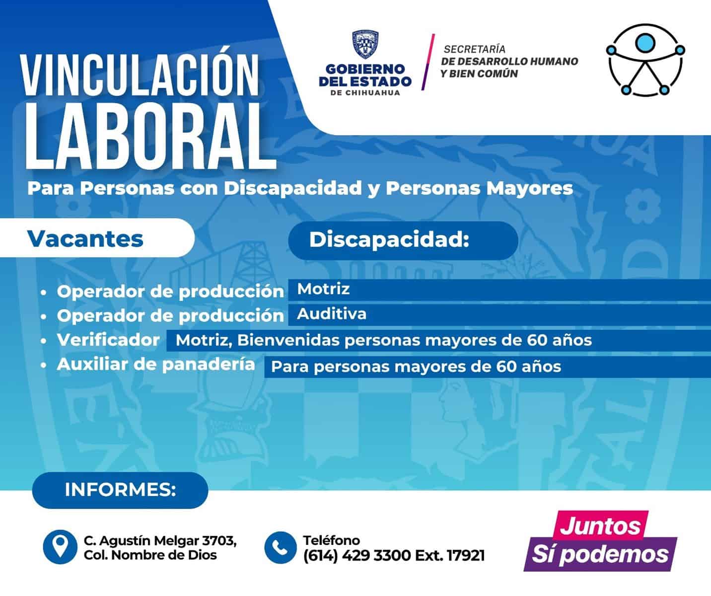 La Secretaría de Desarrollo Humano y Bien Común (SDHyBC), dio a conocer las vacantes disponibles para personas con discapacidad o adultas mayores, que deseen incorporarse al sector productivo en la entidad.