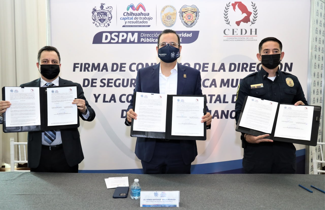 El alcalde de Chihuahua, Marco Bonilla Mendoza, encabezó la firma de un convenio de colaboración entre la Comisión Estatal de los Derechos Humanos (CEDH), y la Dirección de Seguridad Pública Municipal (DSPM), a fin de que la primera, tenga acceso a las cámaras inteligentes de las patrullas que usan los elementos de la Policía Municipal para que vigile y constate el respeto a los derechos humanos de las personas detenidas, durante su traslado a los separos municipales.