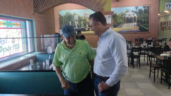 Ciudad Juárez.- El presidente municipal de la ciudad de Chihuahua, Marco Bonilla, visitó la frontera, donde recorrió un mercado popular y desayunó con comerciantes. Posteriormente, se reunió con ganaderos de la región.