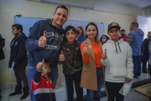 El alcalde Marco Bonilla, su esposa Karina Olivas y sus hijos, acudieron al centro de votación ubicado en la escuela preparatoria “Maestros Mexicanos”, para elegir los proyectos inscritos en el Presupuesto Participativo e invitaron a las y los chihuahuenses a decidir por las obras propuestas que más convengan a su colonia.