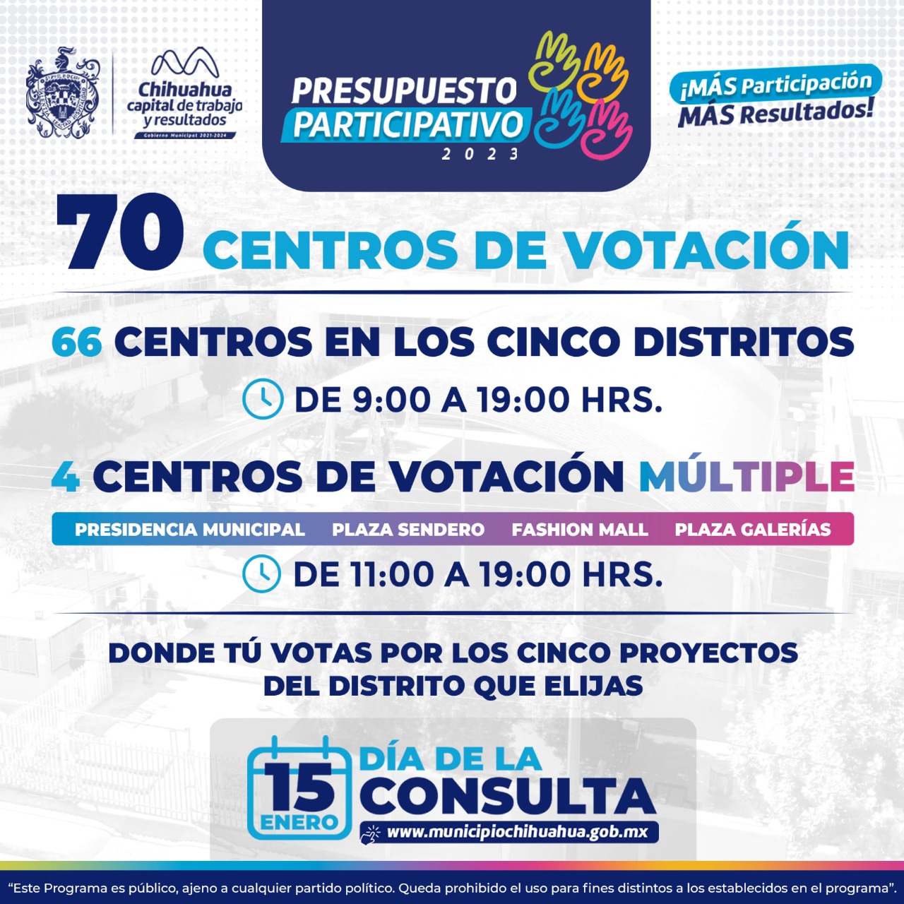 Para que los ciudadanos puedan votar por sus cinco proyectos preferidos, se instalarán 70 centros de votación; 66 distribuidos en los cinco distritos electorales, con un horario de 9:00 a 19:00 horas; mientras que los cuatro restantes serán de votación múltiple, donde los votantes podrán elegir el distrito en el que quieren votar; estos permanecerán abiertos de 11:00 a 19:00 horas.