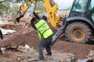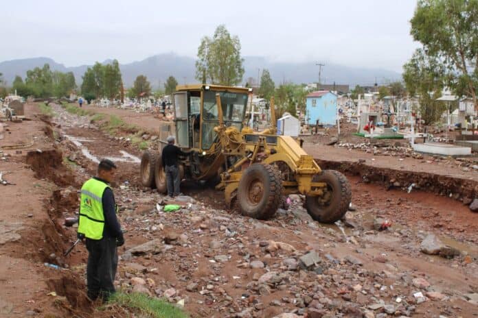 Una motoconformadora se encuentra dando cause al arroyo que cruza al interior del panteón y seis cuadrillas manuales trabajan en la limpieza al interior retirando el escombro que pudiese haber sobre las tumbas.